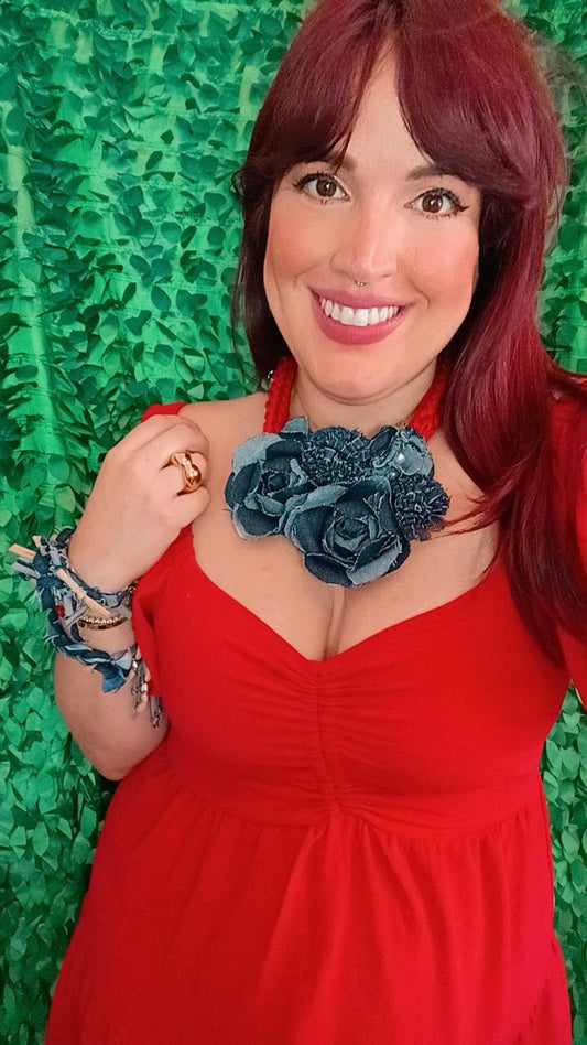 Denim and red flowers Necklace