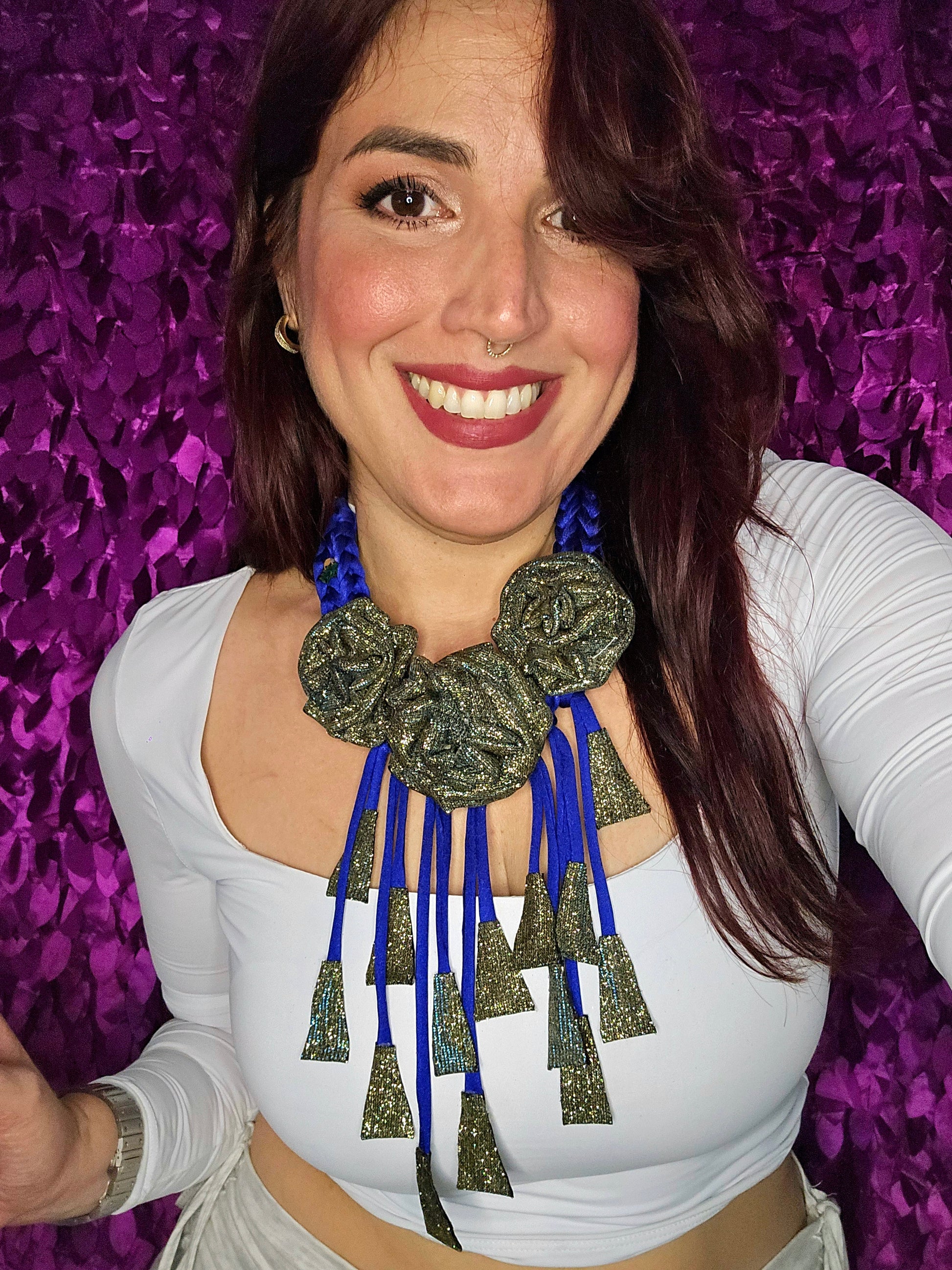 Sus flores son color dorado con destellos azules para que combine con el tejido azul royal. Además, lleva unos flecos con los mismos detalles de sus flores! 😍